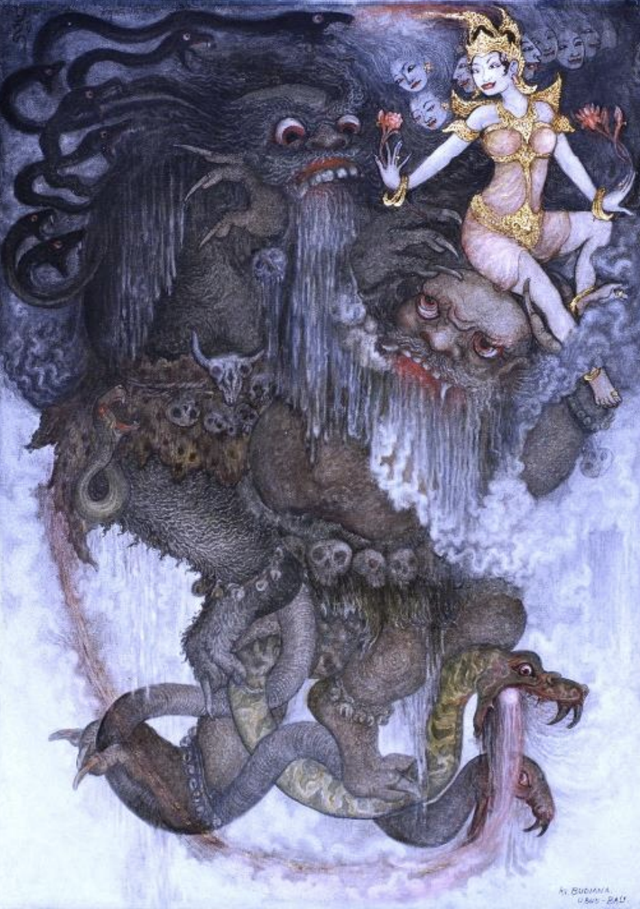 Beranjak dari konsep dua itulah Budiana mengawali gelarannya di Bentara Budaya Bali dengan sebuah ritus instalatif outdoor dan indoor. Konsep dua tentang penciptaan, tentang kelahiran manudia yang dinaungi oleh kosmologi konsep empat yang disebut kanda mpat (sedulur papat di Jawa) yaitu empat entitas yang menemani cabang bayi sejak dalam rahim hingga mengada di Bumi dan kembali melebur pada kosmos. Konsep-konsep itu dielaborasi Budiana menjadi sebuah garapan instalasi dengan memakai, bahasa rupa yang bersumber dari dasar-dasar kesenirupaan Bali yaitu rerajahan.